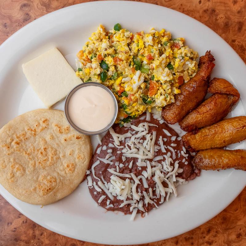 2 eggs, beans, plantain, 1 tortilla, crema, queso