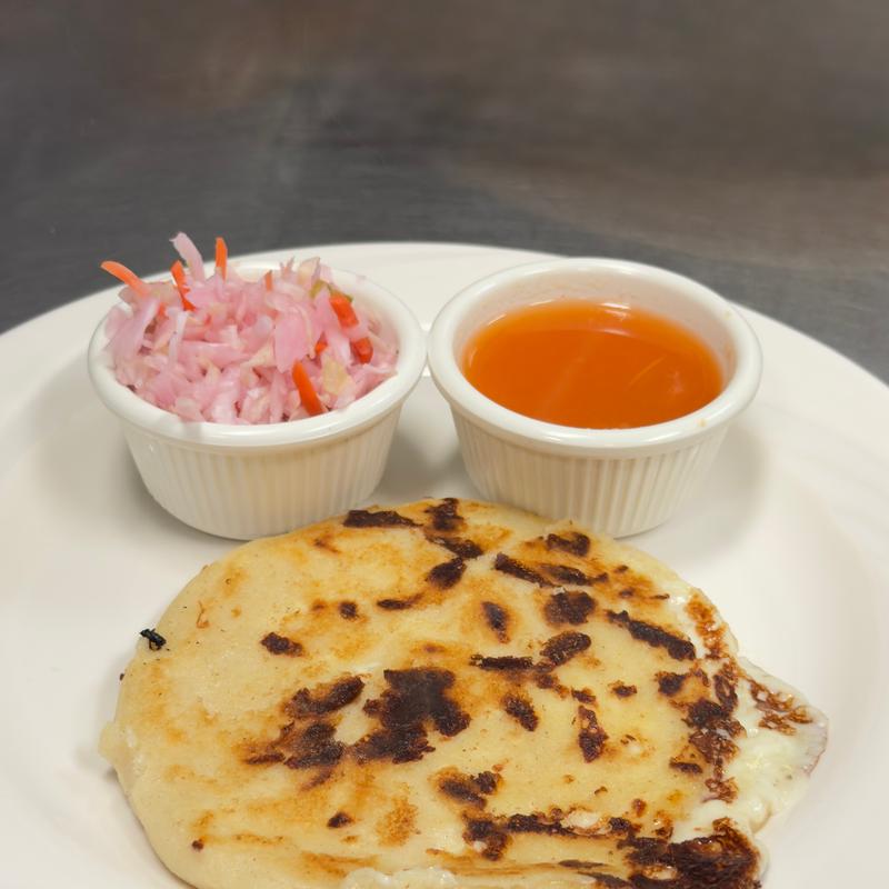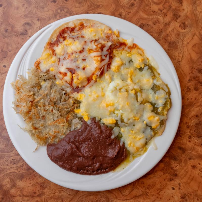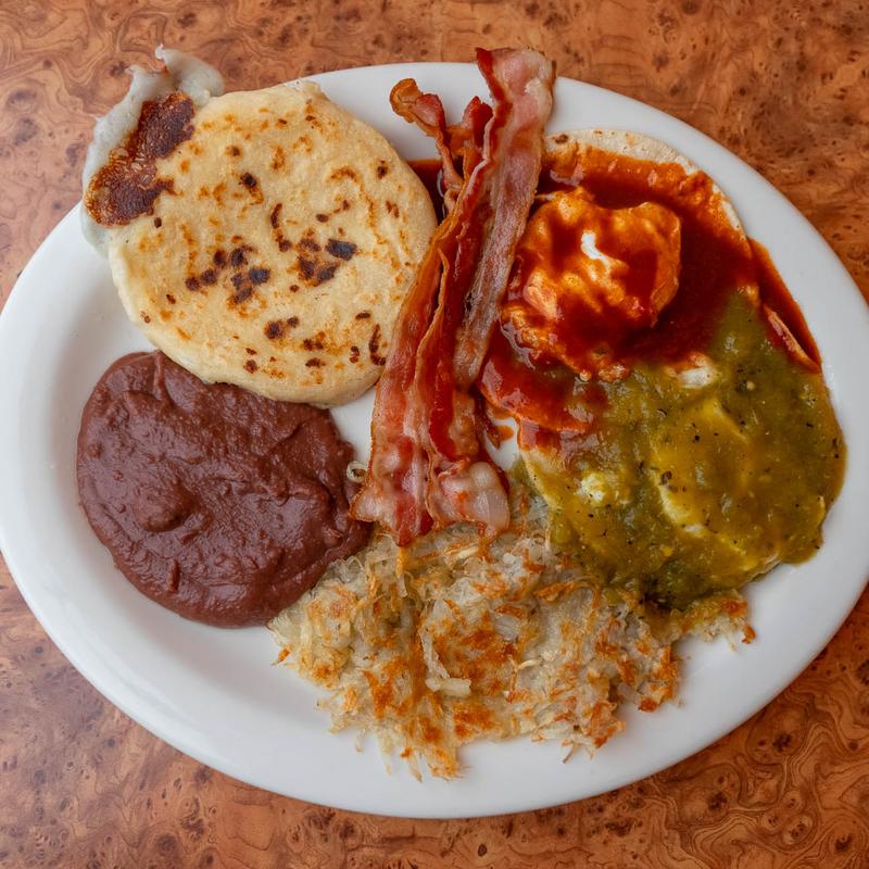 1 pupusa, hash brown, beans, 3 bacon strips, 2 eggs, green or red chile