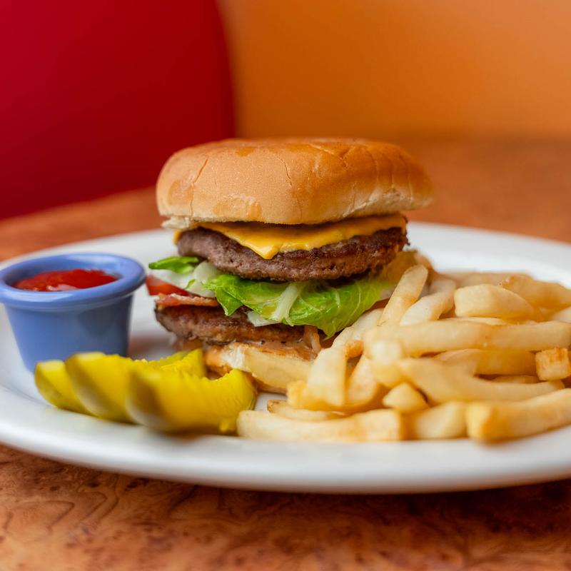 2 beef patty, lettuce, tomato, onion, pickles, 2 bacon strips, green chile, American cheese, special salsa French fries