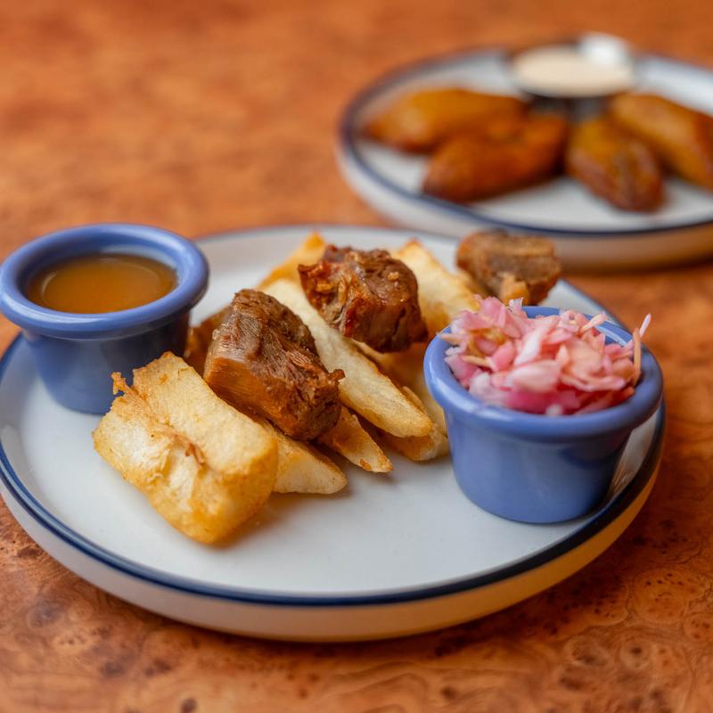 Fried Yucca with Chicharron (pork) with Pickle Cabbage and Salsa